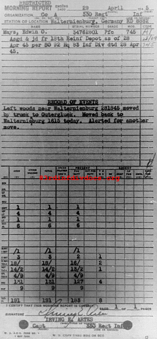 Left woods near Walternienburg 281845 moved by truck to Gutergluck. Moved back to Walternienburg 1615 today. Alerted for another move.