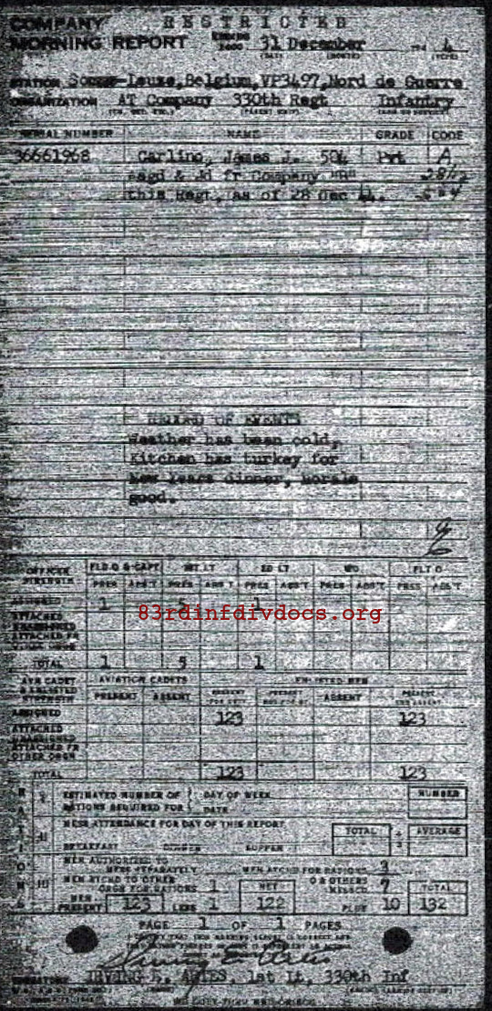 Weather has been cold. Kitchen has turkey for New Years dinner, morale good.