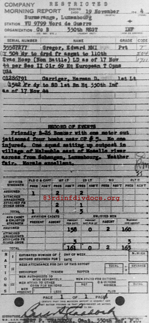 Friendly B-26 Bomber with one motor out jetisoned four bombs near OP#5. No one injured. One squad setting up outpost on village of Malmuhle east of Moselle River across from Schengen, Luxembourg. Weather fair. Morale excellent