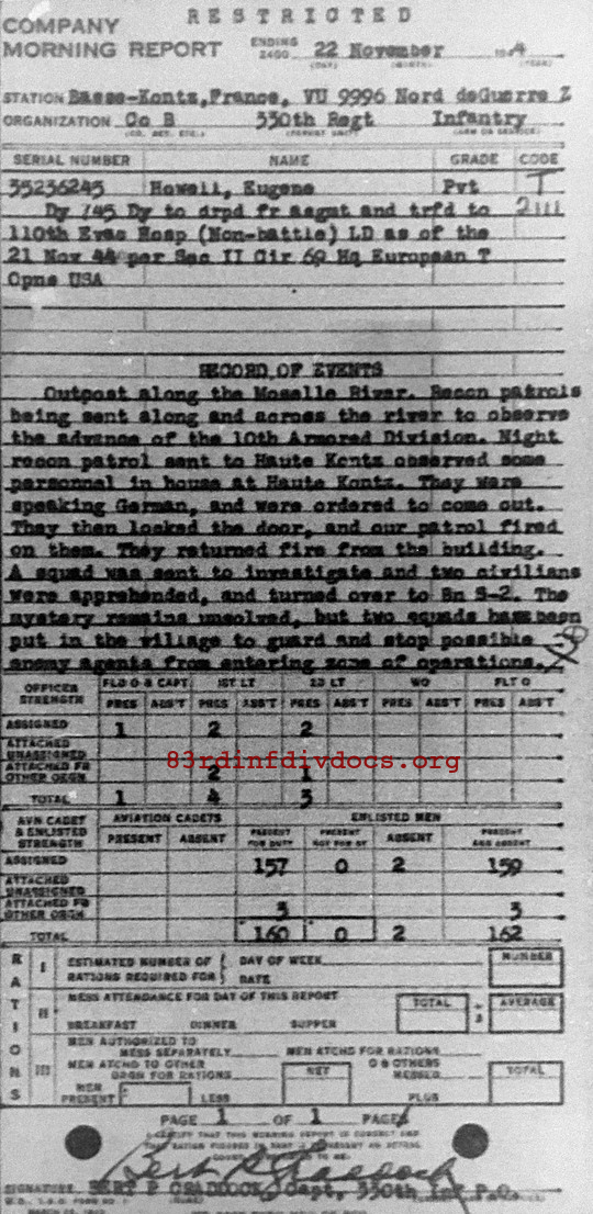 Outpost along the Moselle River. Recon patrols being sent along and across the river to observe the advance of the 10th Armored Division. Night recon patrol sent to Haute Kontz observed some personnel in house at Haute Kontz. They were speaking German, and were ordered to come outp. They then locked the door, and our patrol fired on them. They returned fire from the building. A squad was sent to investigate and two civilians were apprehended and turned over to Bn S-2. The mystery remains unsolved but two squads has been put in the village to guard and stop possible enemy agents from entering zone of operations.
