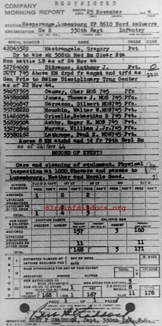 Care and cleaning of equipment. Physicial inspection at 1000. Showers and passes to Luxembourg. Weather and Morale Good.