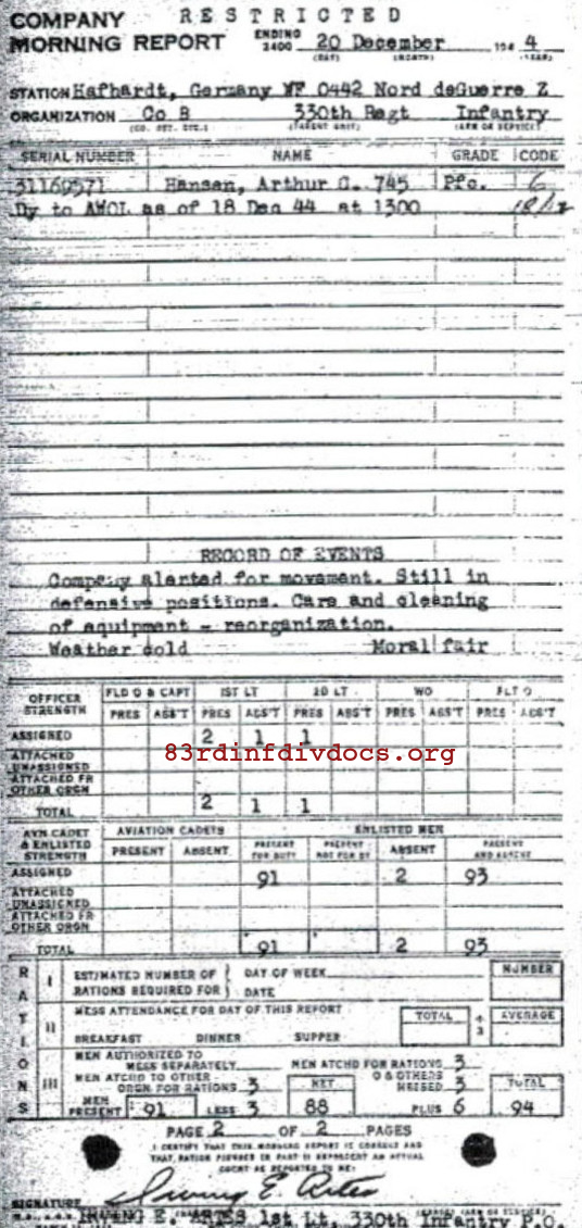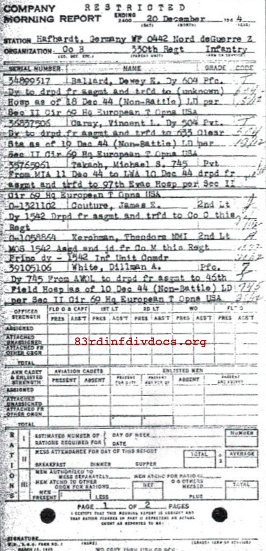 Morning report B/330 for December 20, 1944