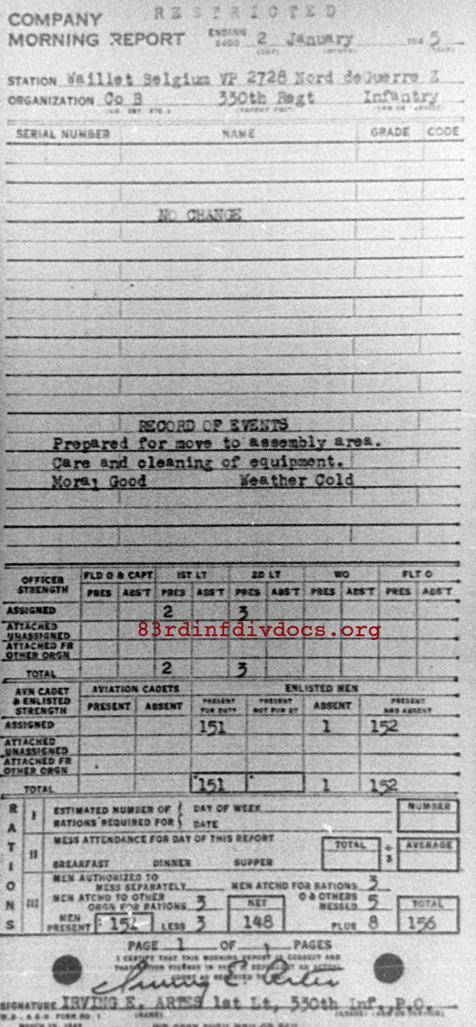 Prepared for move to assembly area. Care and cleaning of equipment. Moral Good. Weather Cold.