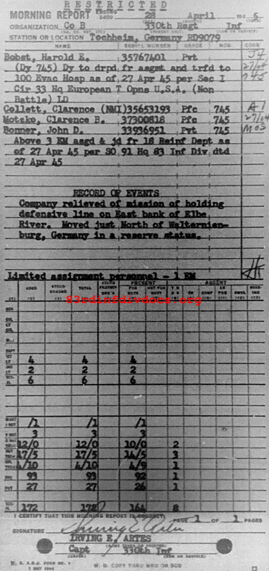 Company relieved of mission of holding defensive line on East bank of Elbe River. Moved just North of Walternienburg, Germany in a reserve status.