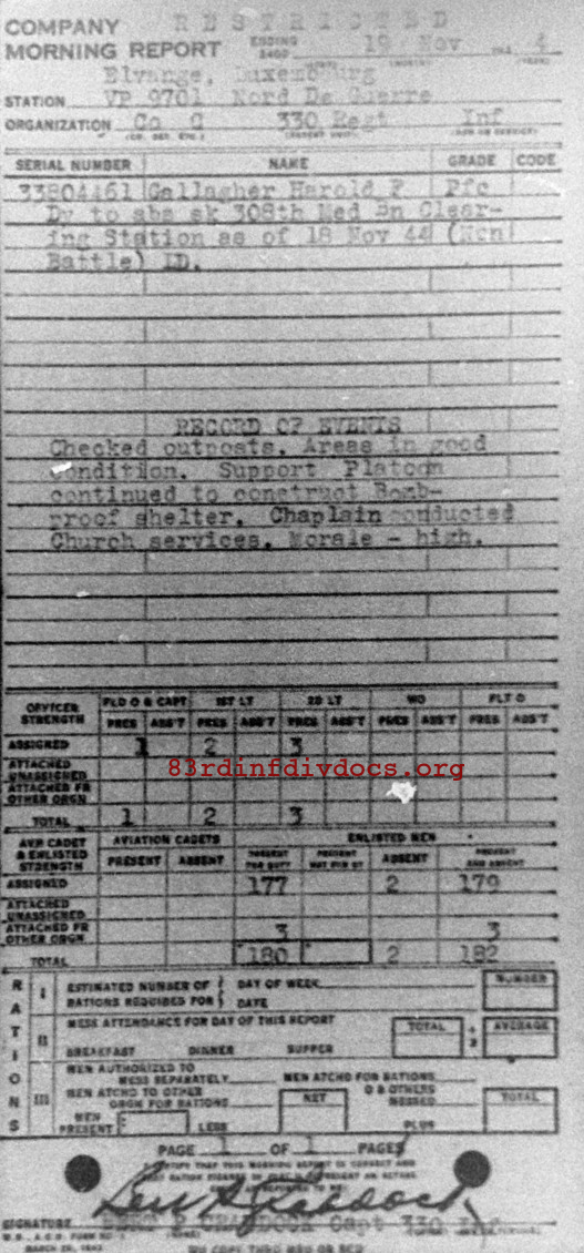 Checked outposts. Areas in good condition. Support Platoon continued to construct Bomb-proof shelter. Chaplain conducted Church services. Morale - high.
