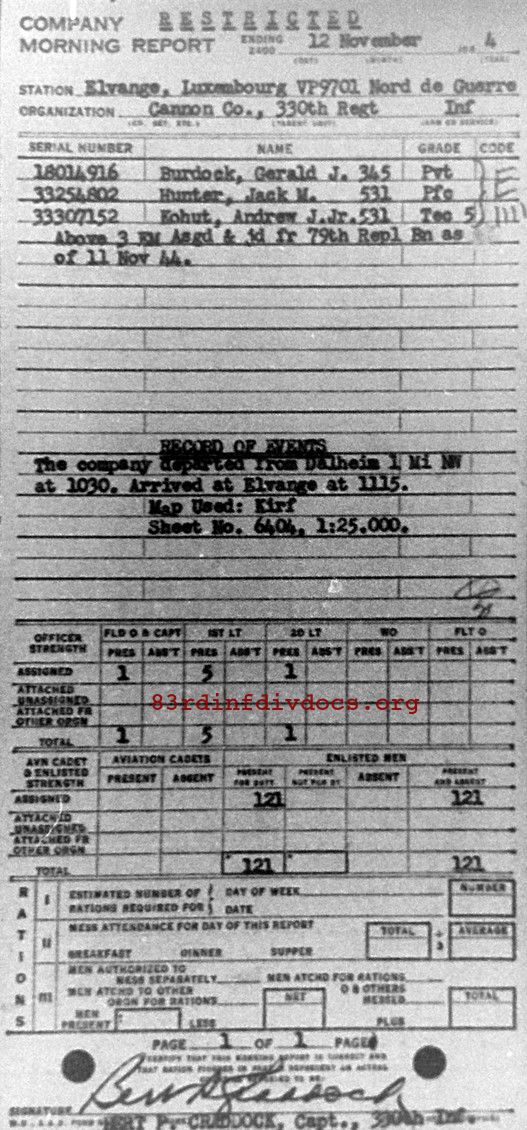 The company departed from Dalheim 11 Mi NW at 1030. Arrived at Elvange at 1115.