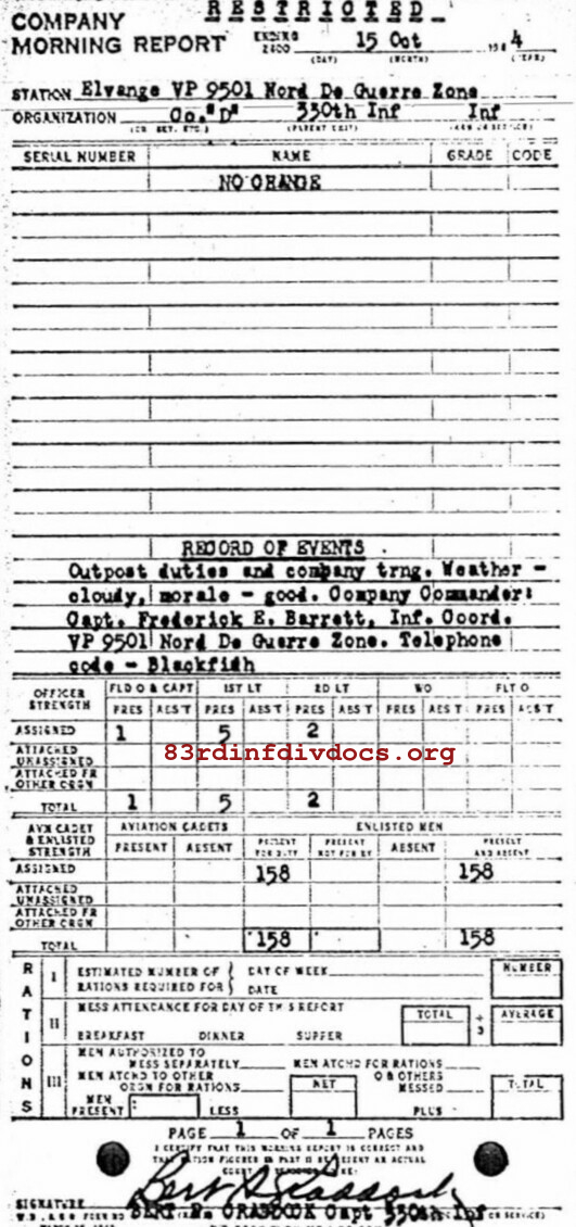 Outpost duties and company trng. Weather - cloudy, morale - good. Company Commander: Capt. Frederick E Barrett, Inf. Coord vP9501 Nord De Guerre Zone. Telephone code - Blackfish