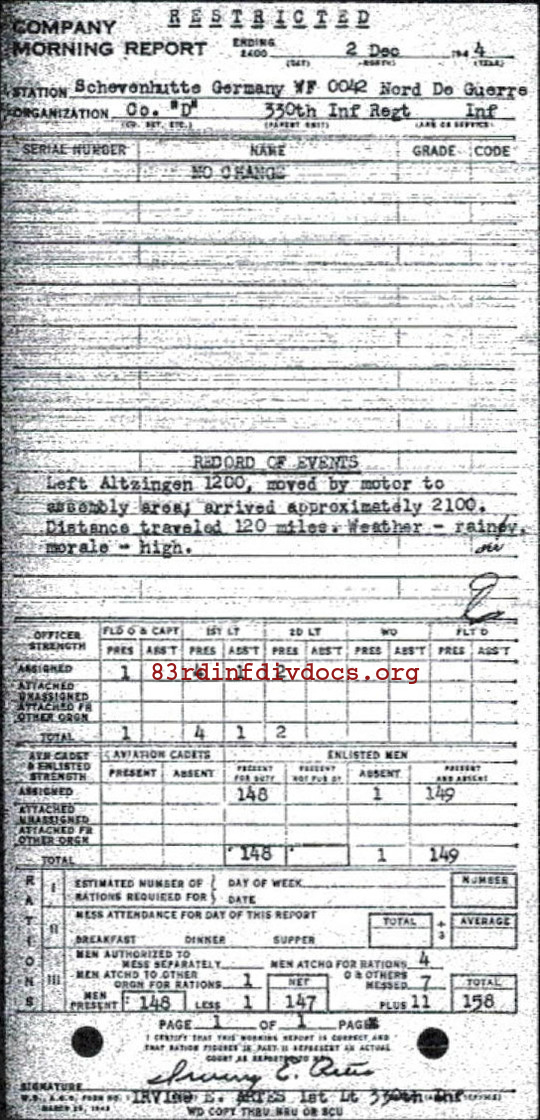 Left Altzingen 1200, moved by motor to assembly area; arrived approximately 2100. Distance traveled 120 miles. Weather rainy. Morale high.