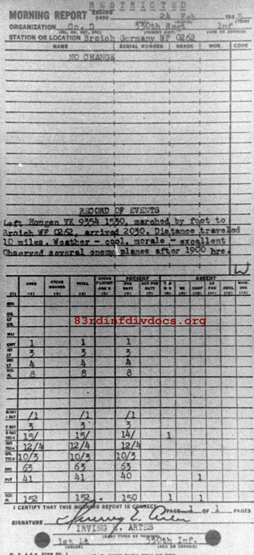 Left Hongen vK9354 1530, marched by foot to Broich wF0262, arrived 2030. Distance traveled 10 miles. Weather - cool. Morale - excellent. Observed enemy planes after 1900 hrs.
