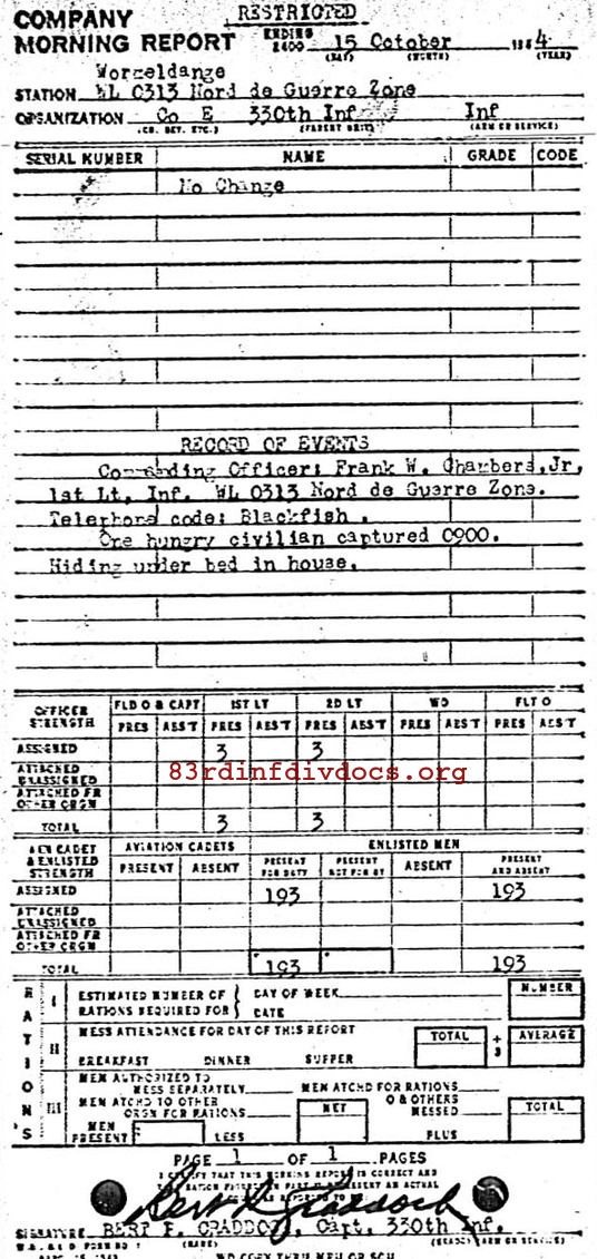 Commanding Officer: Frank W. Chambers, Hr, 1st Lt, Inf. wL0313 NdG. Telephone code: Blackfish. One hungry civilian captured 0900. Hiding under bed in house.