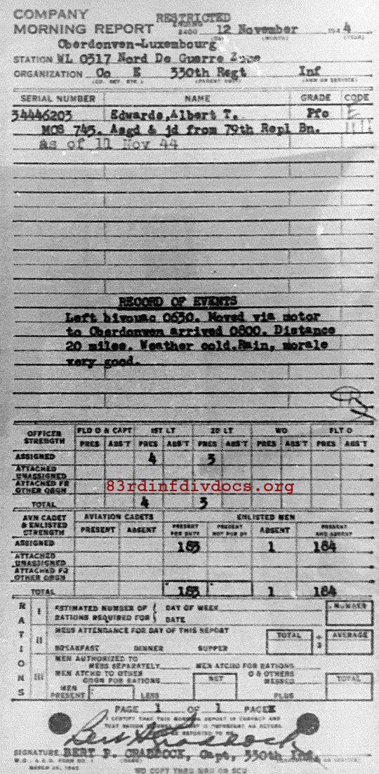 Left bivouac 0630. Moved via motor to Oberdonven arrived 0800. Distance 20 miles. Weather cold. Rain, morale very good.