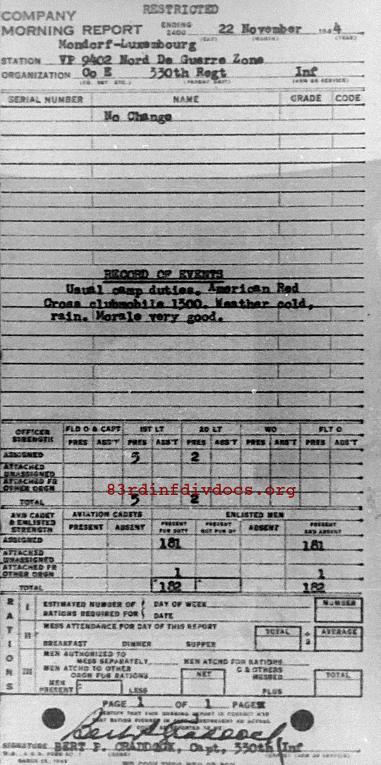 Usual camp duties. American Red Cross clubmobile 1300. Weather cold, rain. Morale very good.