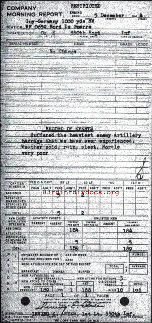 Suffered the heaviest enemy artillery barrage that we have ever experienced. Weather cold, rain, sleet. Morale very poor.