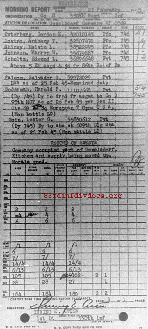 Morning report E/330 for February 27, 1945