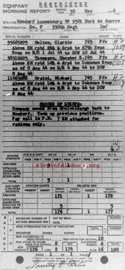 Company moved from Greiveldange back to Mondorf. Took up previous positions. Pay call in P.M. 7 EM attached for rations only.