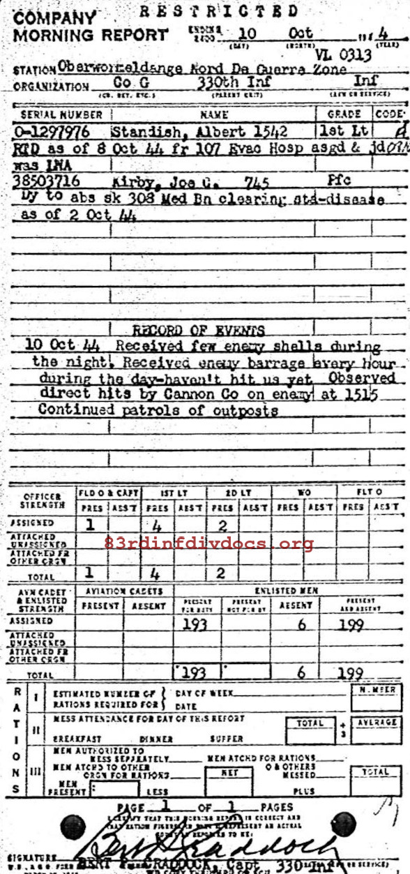 10 Oct 44 - Received few enemy shells during the night. Received enemy barrage every hour during the day - haven't hit us yet. Observed direct hits by Cannon Co on enemy at 1515. Continued patrols of outposts.