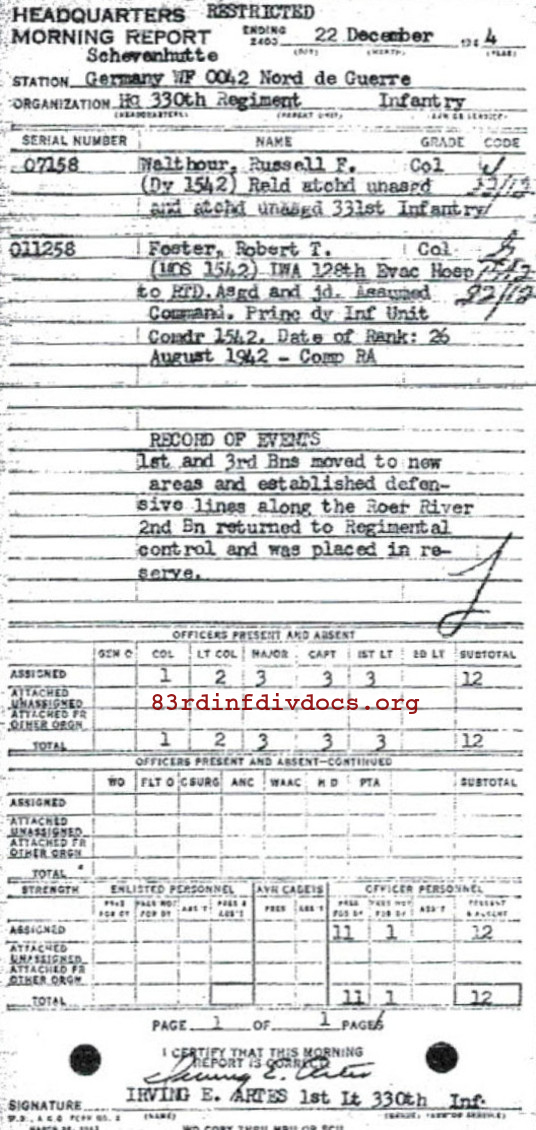 1st and 3rd Bns moved to new areas and established defensive lines long the Roer River. 2nd Bn returned to Regimental control and was placed in reserve.