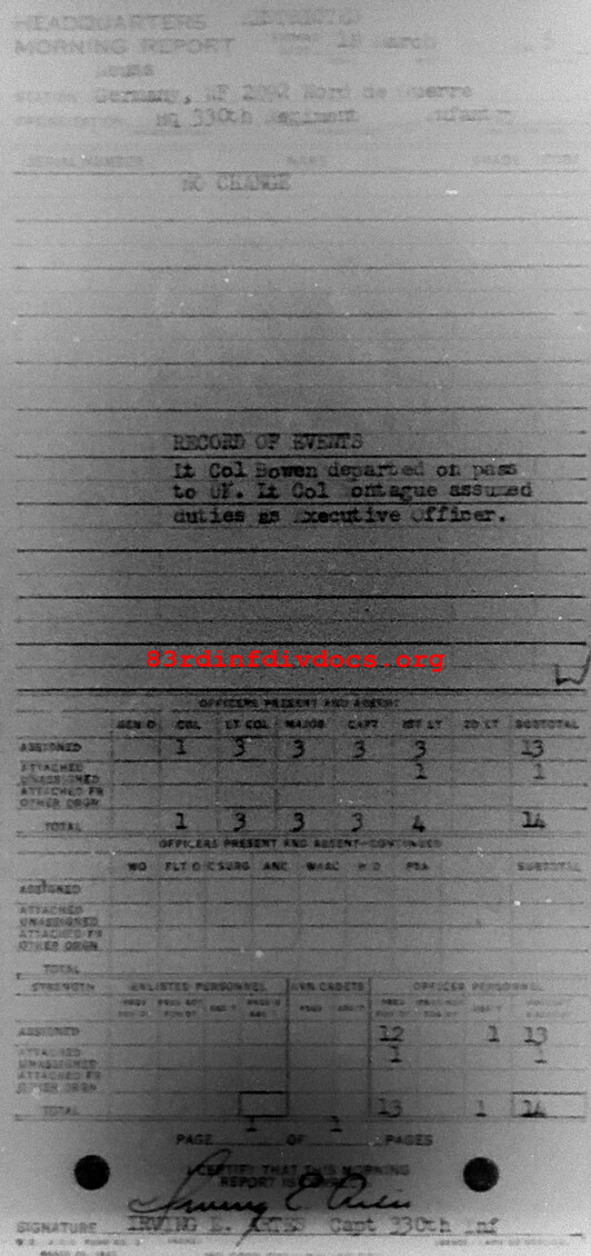 Lt Col Bowen departed on pass to UK. Lt Col Montague assumed duties as Executive Officer.