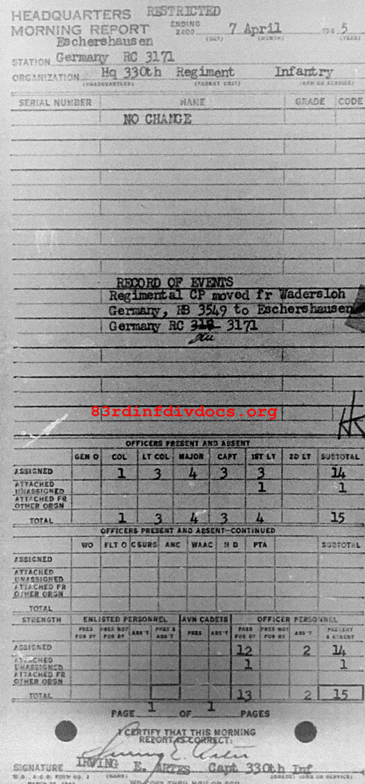 Regimental CP moved fr Wadersloh, Germany rB3549 to Eschershausen, Germany rC3171