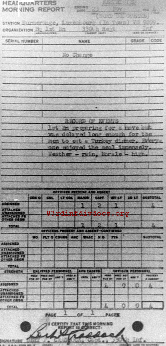 1st Bn preparing for a move but was delayed long enough for the men to eat a Turkey dinner. Everyone enjoyed the meal immensely. Weather - rain. Morale - high.
