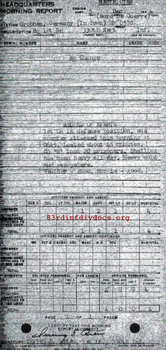 1st Bn in defense position, was counter attacked this morning at 0645, lasted about 45 minutes. Co B took 20 prisoners. Shelling has been heavy all day. Heavy cold, mud everywhere. Weather - good. Morale - good.