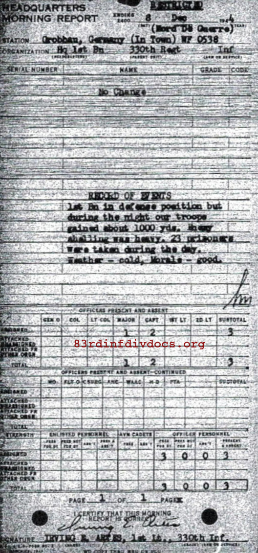 1st Bn in defensive position but during the night our troops gained about 1000 yds. Enemy shelling was heavy during the day. 23 prisoners were taking during the day. Weather - cold. Morale - good.