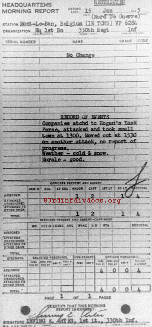 Companies atchd to Hogan's Task Force, attacked and took small town at 1300. Moved out at 1530 on another attack, no report of progress. Weather - cold & snow. Morale - good.