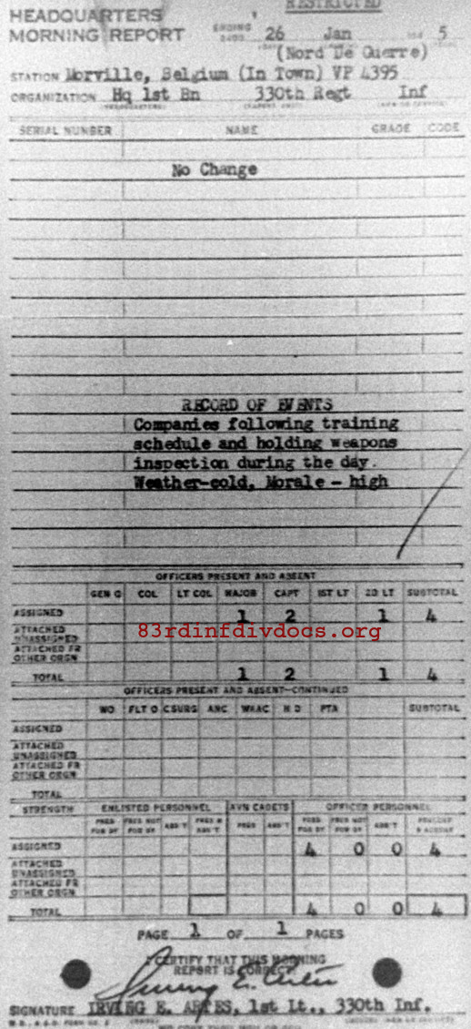Companies following training schedule and holding weapons inspection during the day. Weather - cold. Morale - high.