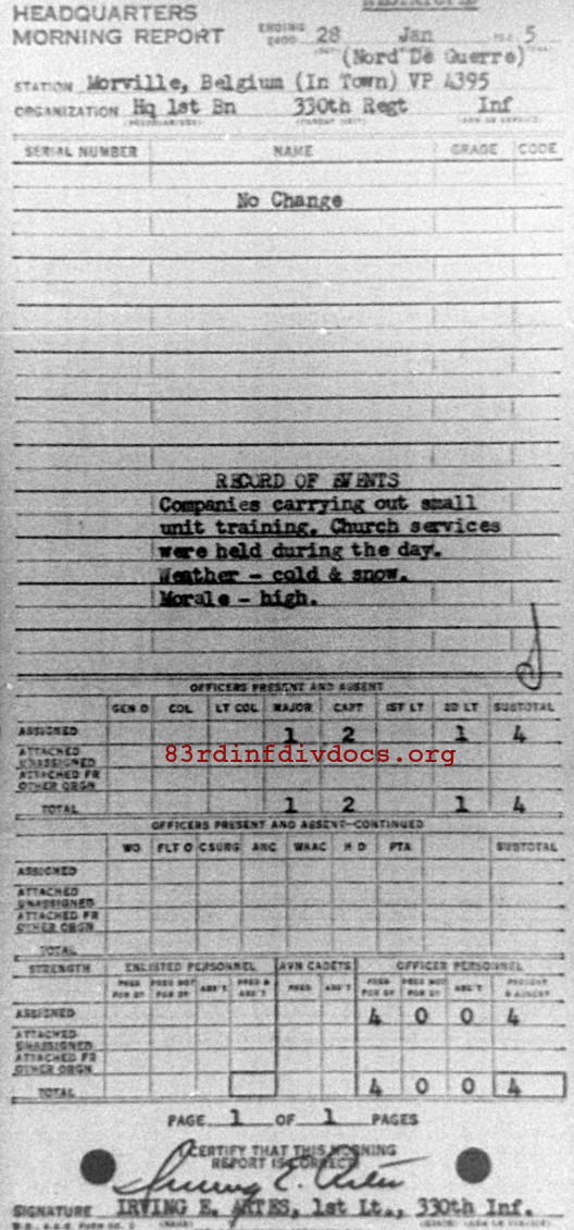 Companies carrying out small unit training. Church services were held during the day. Weather - cold & snow. Morale - high.