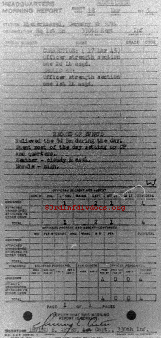 Relieved the 3rd Bn during the day. Spent most of the day setting up CP and quarters. Weather - cloudy & cool. Morale - high.