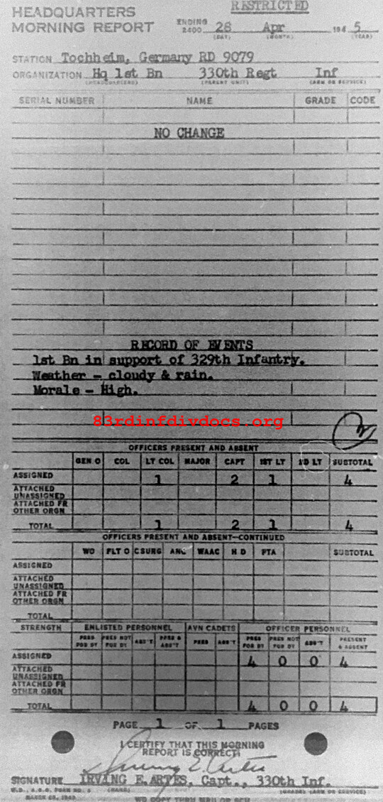 1st Bn in support of 329th Infantry. Weather - cloudy & rain. Morale - high.