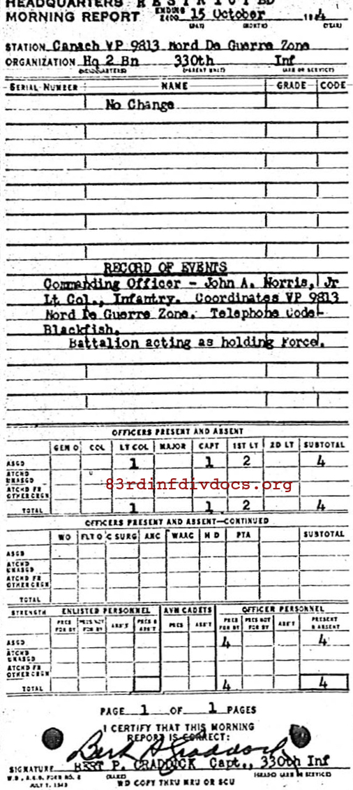 Commanding Officer - John A. Norris, Jr Lt Col, Infantry. Coordinates vP9813, NdG. Telephone Code - Blackfish. Battalion acting as holding Force.