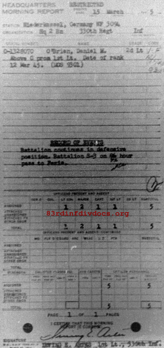Battalion continues in defensive position. Battalion S-3 on 72 hour pass to Paris.