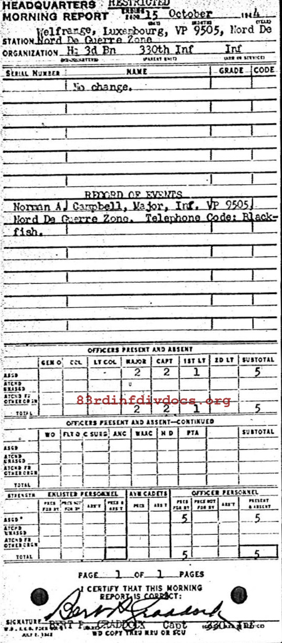 Norman A. Campbell, Major Inf, vP9505. NdG. Telephone Code: Blackfish.