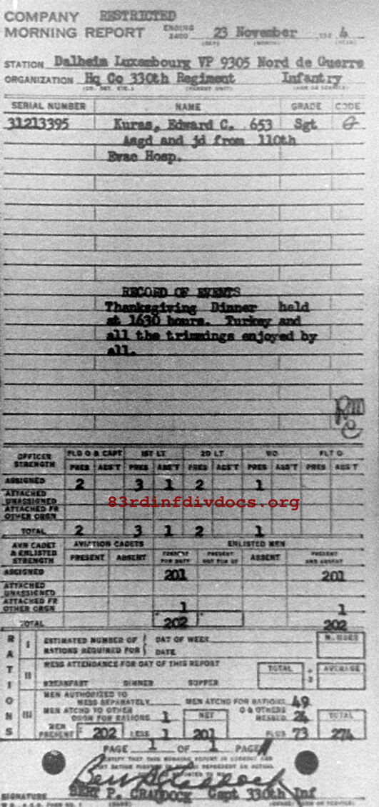 Thanksgiving Dinner held at 1630 hours. Turkey and all the trimmings enjoyed by all.