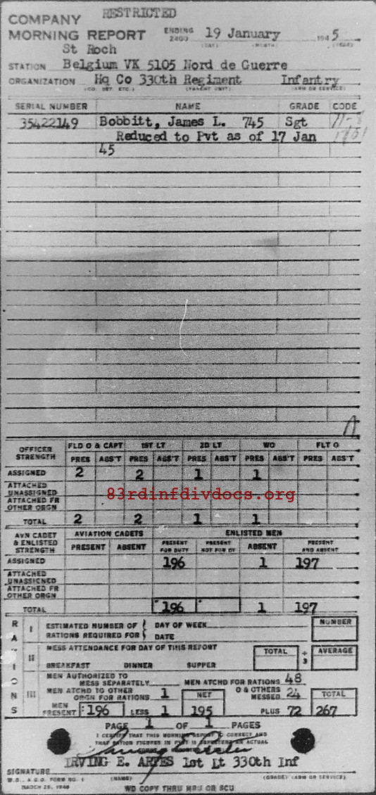 Morning report HQCO/330 for January 19, 1945