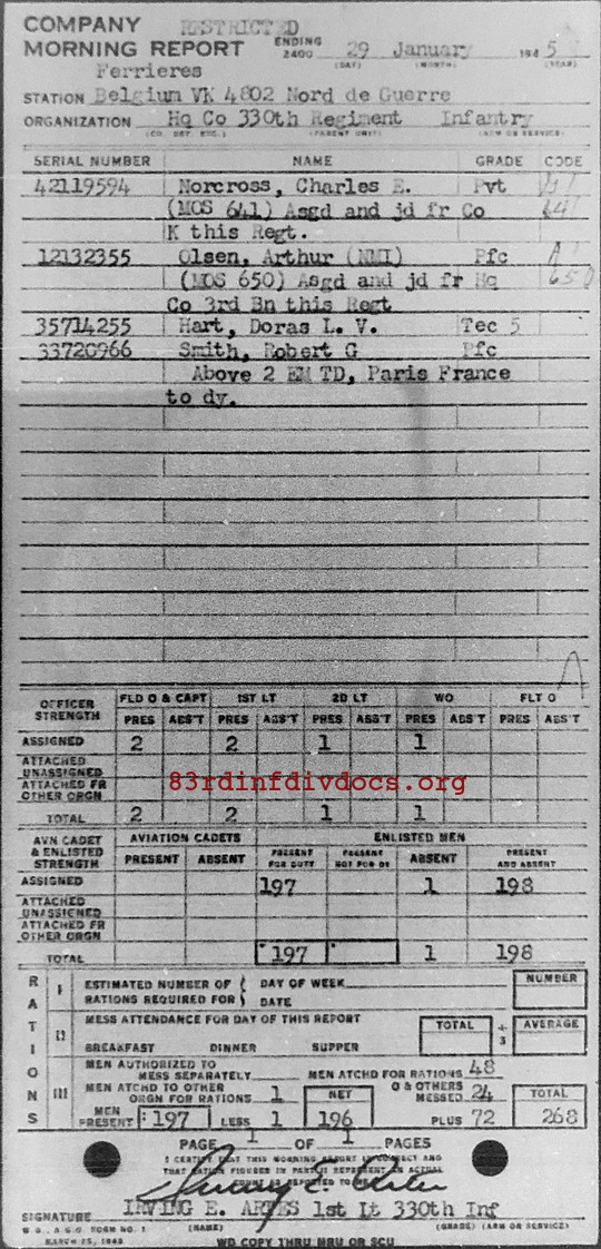 Morning report HQCO/330 for January 29, 1945