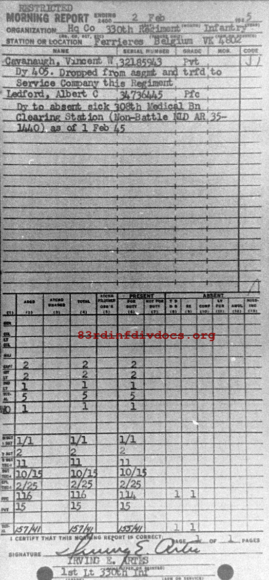 Morning report HQCO/330 for February 2, 1945