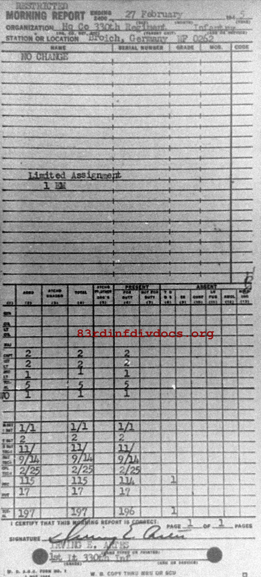 Morning report HQCO/330 for February 27, 1945