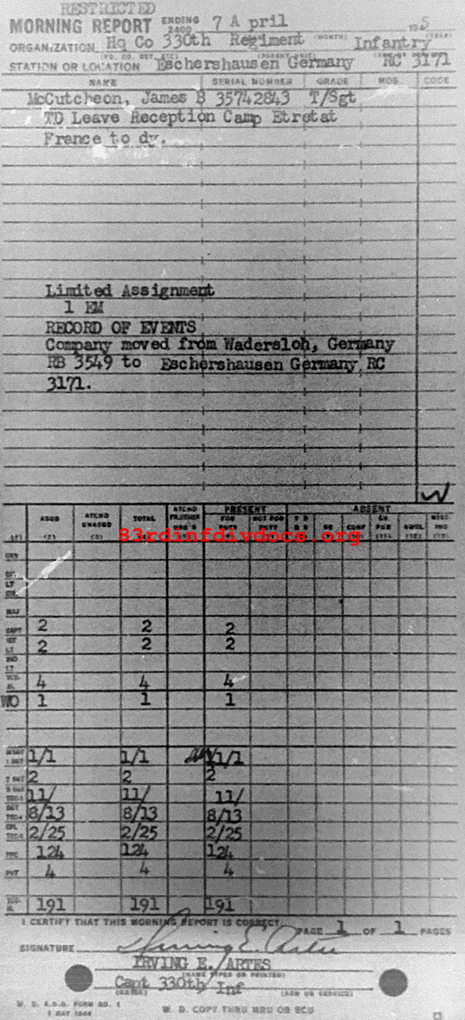 Morning report HQCO/330 for April 7, 1945