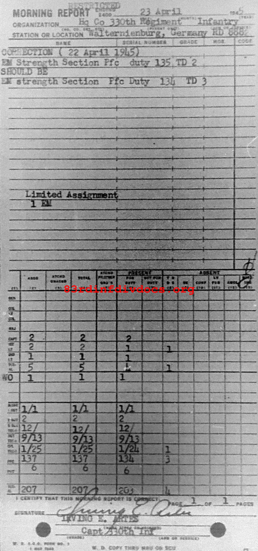 Morning report HQCO/330 for April 23, 1945