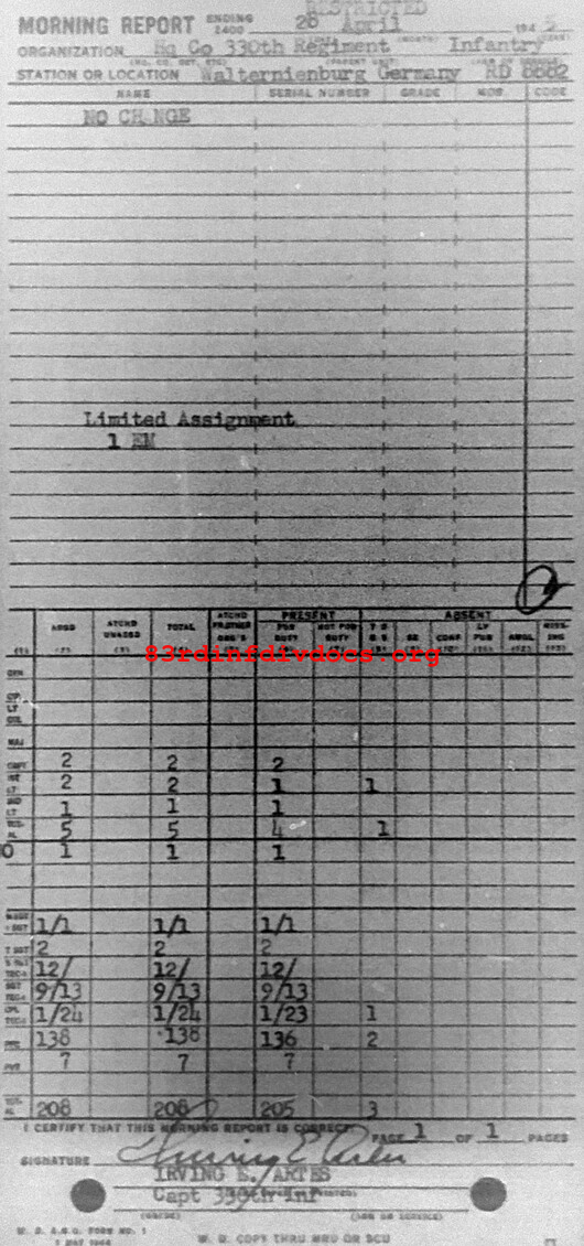Morning report HQCO/330 for April 28, 1945