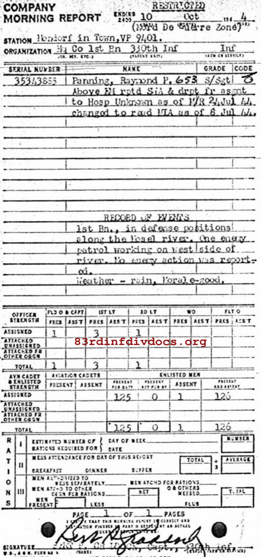 1st Bn., in defense position along the Mosel river. One enemy patrol working on west side of river. No enemy action was reportd. Weather - rain. Morale - good.