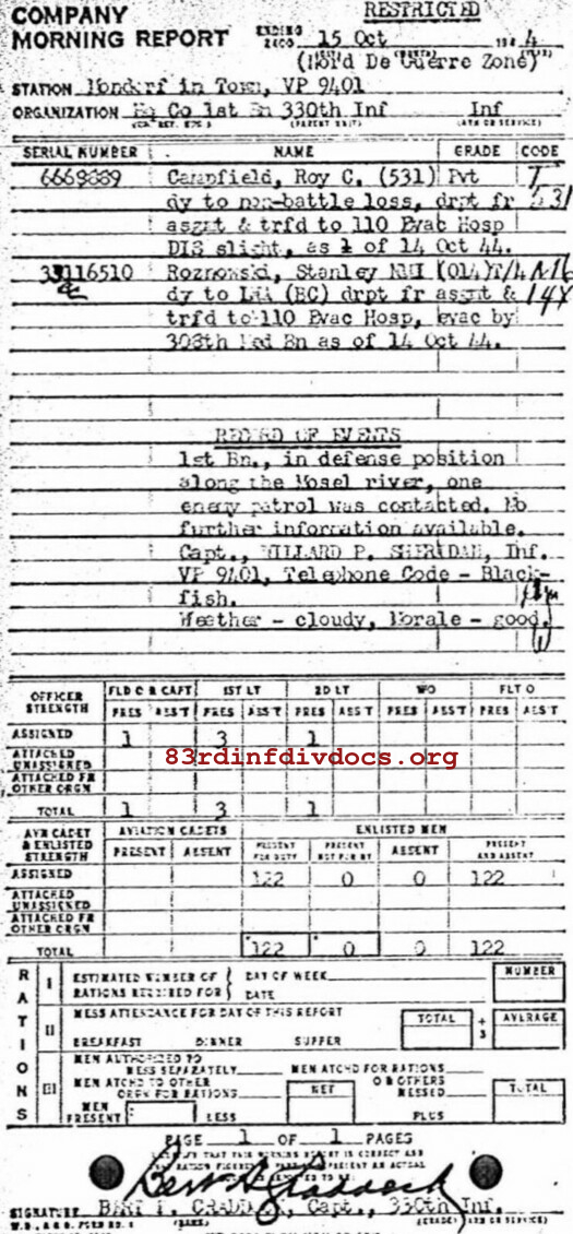 Morning report HQCO1BN/330 for October 15, 1944