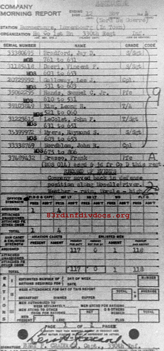 Company moved back in defense position along Moselle river. Weather - rain. Morale - high.