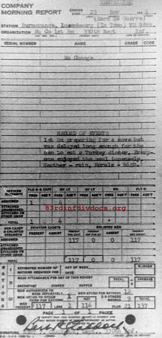 1st Bn preparing for a move but was delayed long enough for the men to eat a Turkey dinner. Everyone enjoyed the meal immensely. Weather - rain. Morale - high.