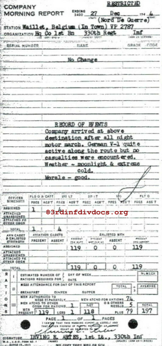 Company arrived at above destination after all night motor march. German V-1 quite active along the route but no casualties were encountered. Weather moonlight & extreme cold. Morale - good.