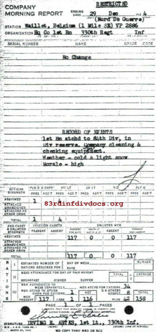1st Bn atchd to 84th Div & held in Div reserve. Company cleaning & checking equipment. Weather - cold & light now. Morale - high.