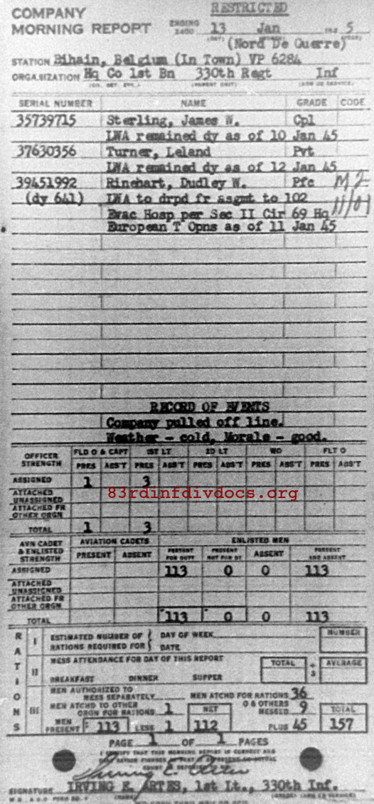 Morning report HQCO1BN/330 for January 13, 1945