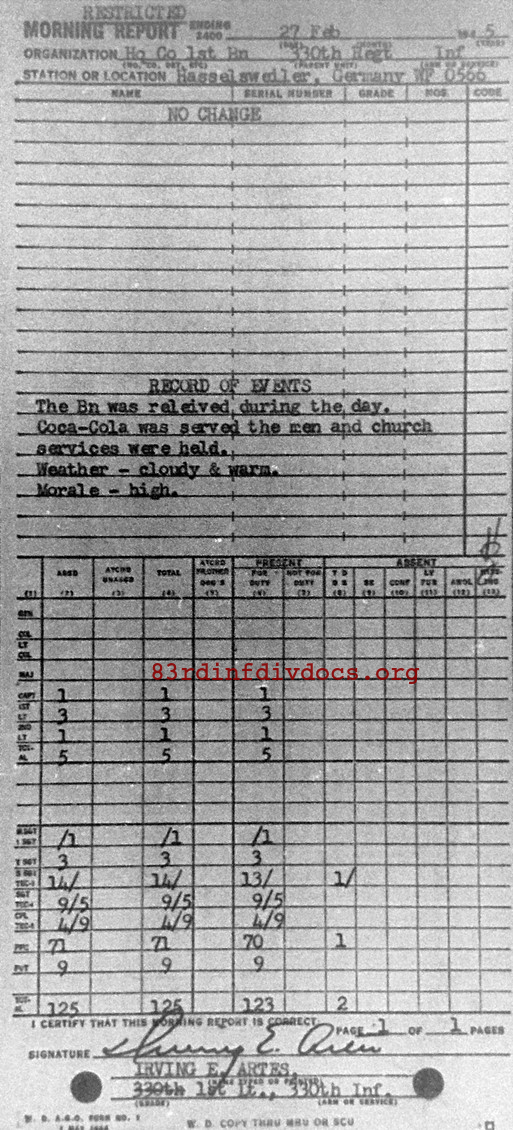 Morning report HQCO1BN/330 for February 27, 1945